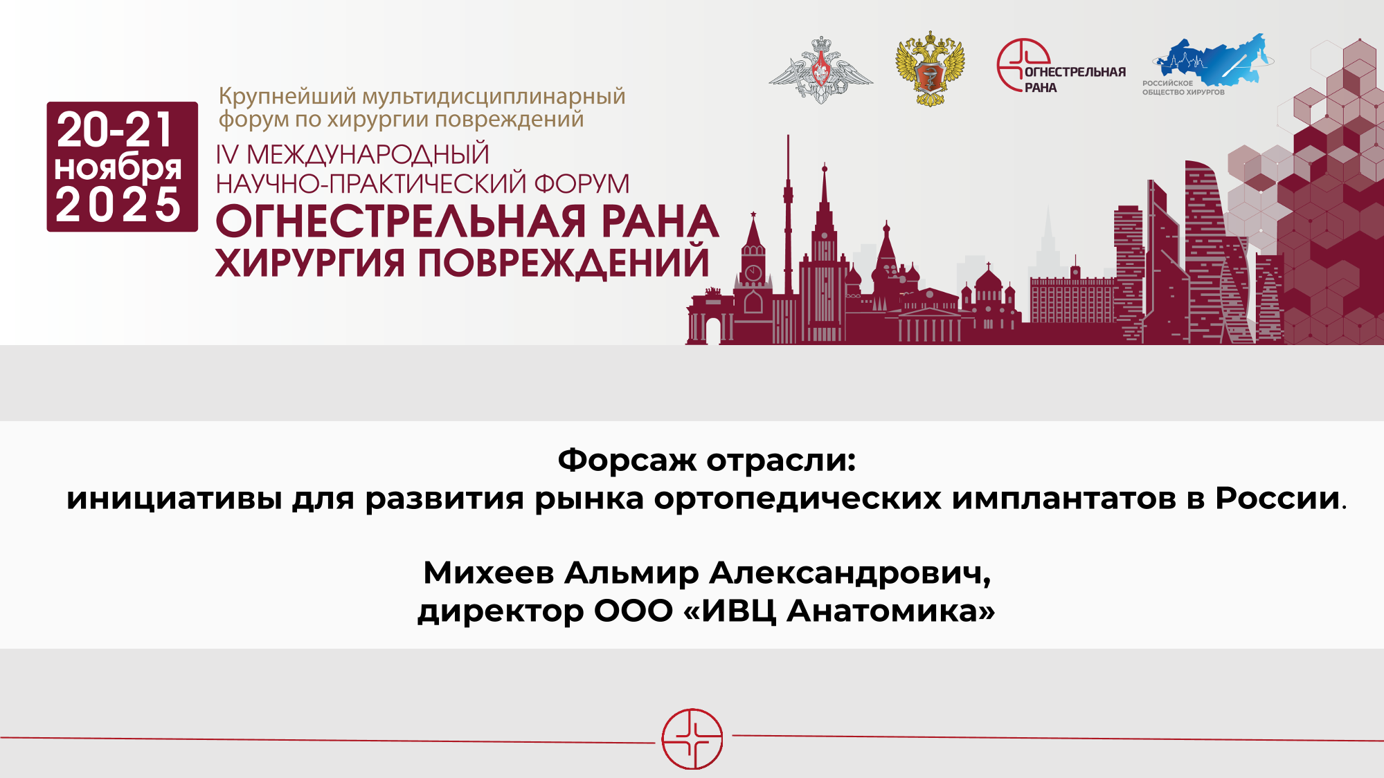 Альмир Михеев, директор ООО «ИВЦ Анатомика», выступил с докладом на форуме «Огнестрельная рана-2025», представив ключевые инициативы для развития рынка ортопедических имплантатов в России.